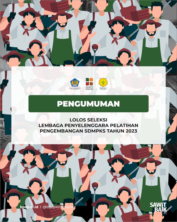 Badan Pengelola Dana Perkebunan Kelapa Sawit (BPDPKS) telah melakukan rangkaian seleksi dan penilaian atas proposal yang masuk berdasarkan Pengumuman Direktur Utama BPDPKS Nomor PENG-1/DPKS/2023 tanggal 11 Januari 2023. Selanjutnya, BPDPKS menyatakan Lembaga Penyelenggara Pelatihan yang memenuhi kriteria sebagai Lembaga Penyelenggara Pelatihan Pengembangan Sumber Daya Manusia Perkebunan Kelapa Sawit Tahun 2023 yaitu: